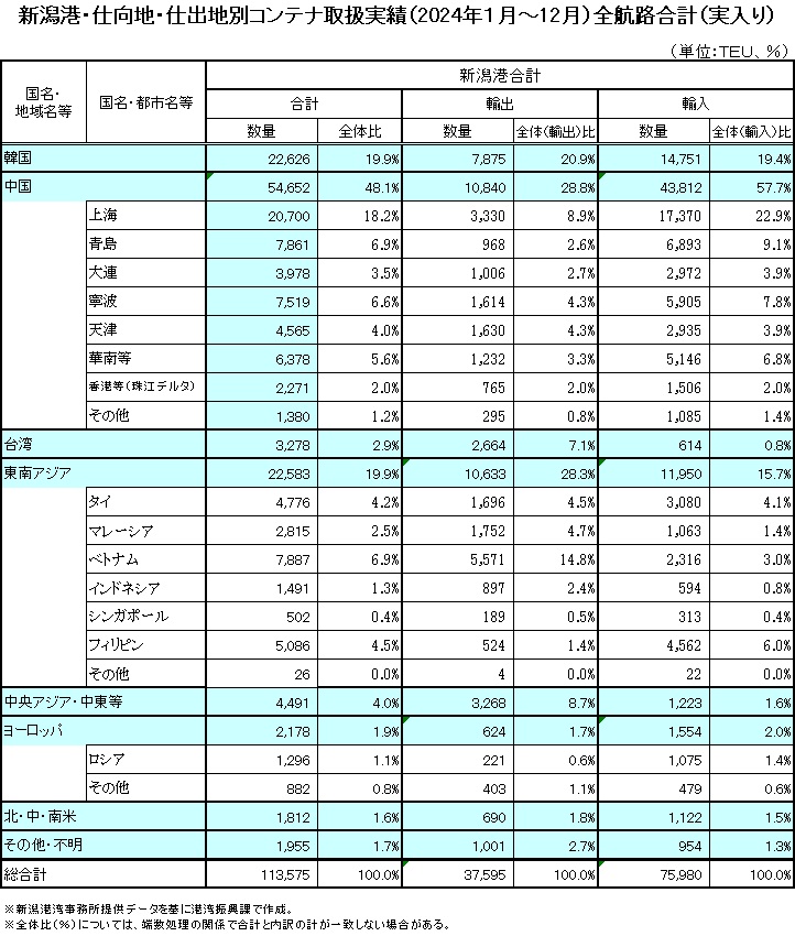 新潟港・仕向地・仕出地別コンテナ取扱実績(単位:TEU)